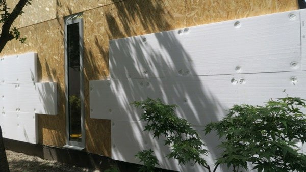 Photo 1 : Mise en oeuvre des panneaux de polystyrène qui servent de support à l’enduit organique, taloché.