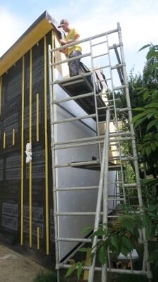 Photos 2 : mise en oeuvre de l’enduit, à la taloche (technique adaptée à la pose d’enduits sur ossature bois. On utilise parfois le terme « ETICS », qui signifie « External Thermal Insulation Composite System » pour système d’isolation thermique extérieure par enduit.