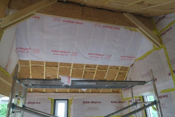Photo 8 : isolation thermique intérieure avec nos panneaux de fibre de bois ; puis mise en place du pare-vapeur.