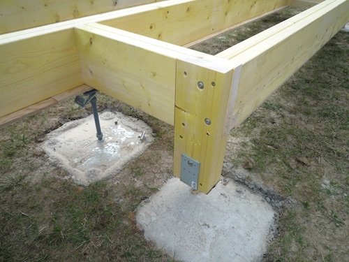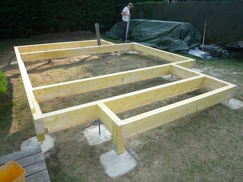 Photo 1 : préparation de l’ossature du plancher bois de notre bureau de jardin