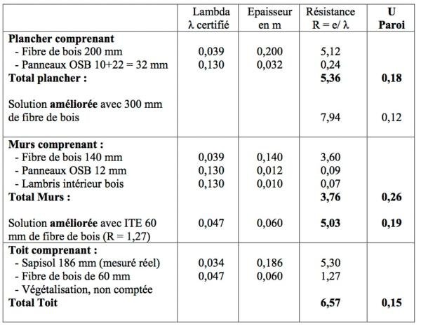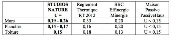 Les valeurs de transmission thermique des parois (murs, planchers, toit) Studios-Nature sont remarquables :