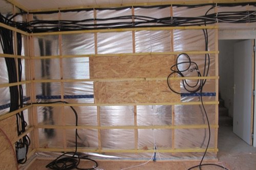 Photo 5 : le Clicwall se pose sur des liteaux ou des rails métalliques. L’électricité circule derrière. Nous avons soigneusement renforcé les zones qui supporteront les meubles de cuisine et la grande télévision avec des plaques d’OSB vissées dans les montants d’ossature.