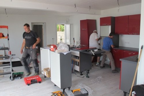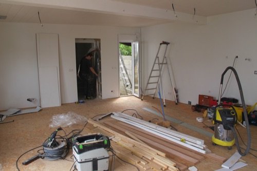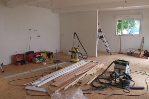 Photo 4 : Cette grande pièce de 50 m2, soit 80 m2 de murs a été recouverte de Clicwall, entièrement terminé, en une journée à deux. Il y avait beaucoup de découpes du fait des fenêtres, volets roulants etc… Dans une hypothèse avec moins de découpe, toute la pièce aurait été terminée en une demi journée.