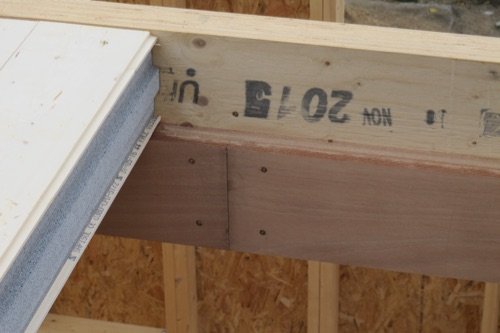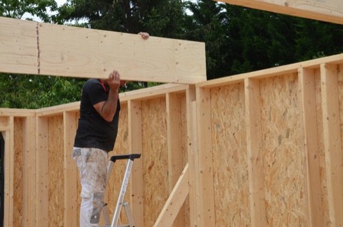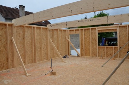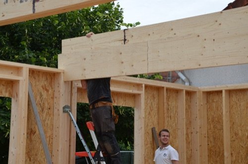 Photo 3 : nous avions prévu des zones spéciales dans les murs, avec des montants triplés, pour supporter ces poutres. Il suffisait ensuite de glisser nos poutres en Lamibois dans ces emplacements et les assembler.
