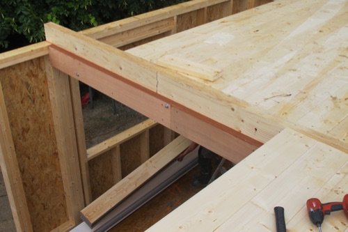Photo 6 : le Sapisol (notre panneau de toiture) nécessite un appui de minimum 60 mm, pour une fixation entre deux appuis. Nous avons donc préparé des planches de contreplaqué de 60 mm (deux fois 30 mm), fixées (vissées et boulonnées) tout le long de la partie inférieure de notre poutres Lamibois.