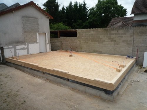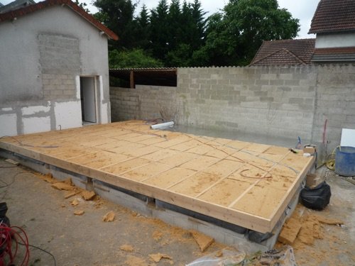 Photo 6 : dalle bois de l’extension totalement isolée et passage des canalisations d’eau (chauffage et cuisine), et des prises électrique de l’ilot central de la cuisine.
