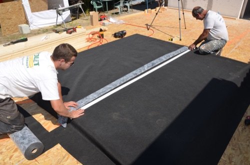 Photo 1 : les murs sont préfabriqués et ensuite fixés sur la lisse basse. Pose du pare-pluie sur les murs en bois qui seront installés le long du mur du voisin