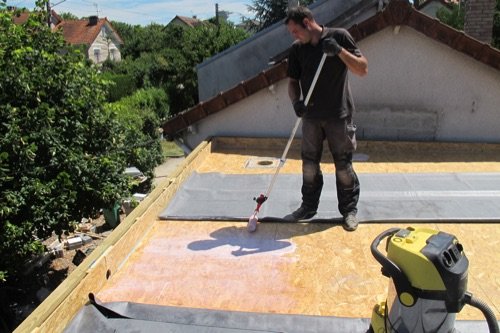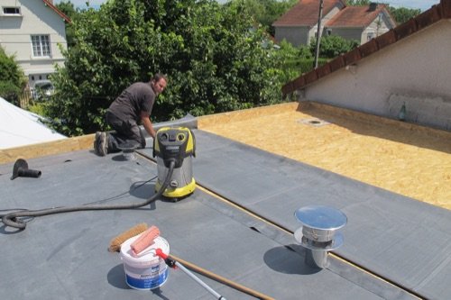 Photo 2 : la membrane EPDM est collée en plein sur le support avec la colle acrylique spéciale. Compte tenu de la surface de l’extension, l’EPDM est en deux morceaux que nous assemblons sur place.