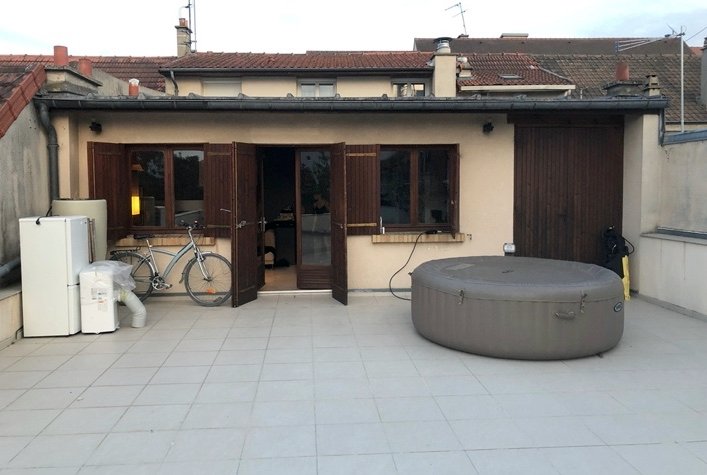 Cet appartement au 1er étage d’une maison de ville dispose d’une très grande terrasse carrelée. Nous allons utiliser cet espace pour construire une extension, sur plus de la moitié de la surface. Le projet n’était pas simple, car l’escalier de la maison est inutilisable, trop petit, et l’accès se fait par une cour en contrebas. Les contraintes de hauteur et du PLU nous ont amené à imaginer des solutions originales pour lancer le projet.
