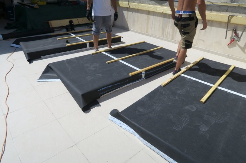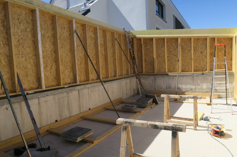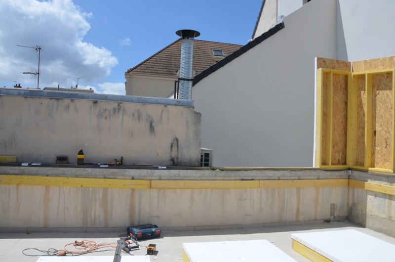 Photo 12 : vue d’ensemble des murs. Nous avons étayé les murs avec nos outils, en créant des supports, pour éviter de percer l’étanchéité de la terrasse pendant la phase chantier