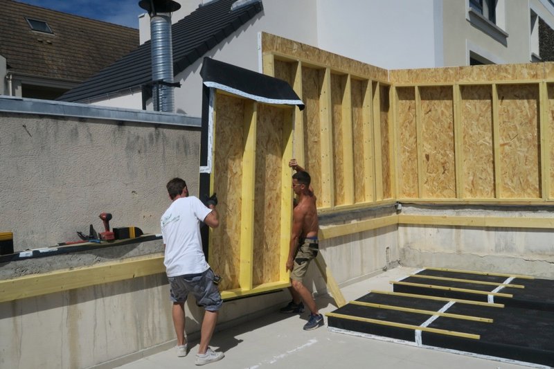 Photo 6 : nous avons préparé des petits murs, de largeur 120 cm (largeur de nos panneaux d’OSB), facilement levable et transportables, à la main sans outil de levage