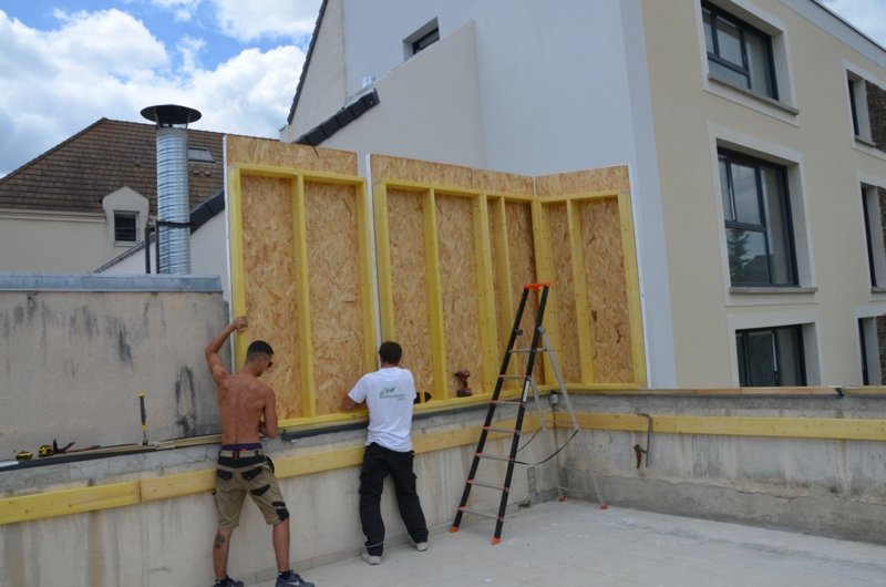 Photo 8 : manutention des murs et installation sur les murs maçonnés existants