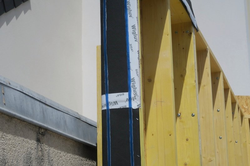 Photo 11 : les pare-pluies sont assemblés entre eux avec le cordon adhésif « Primur » de SIGA. Ce cordon assure un collage des pare-pluies immédiat, durable et particulièrement résistant.