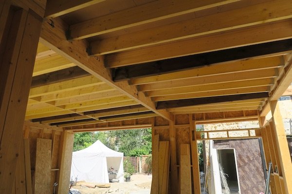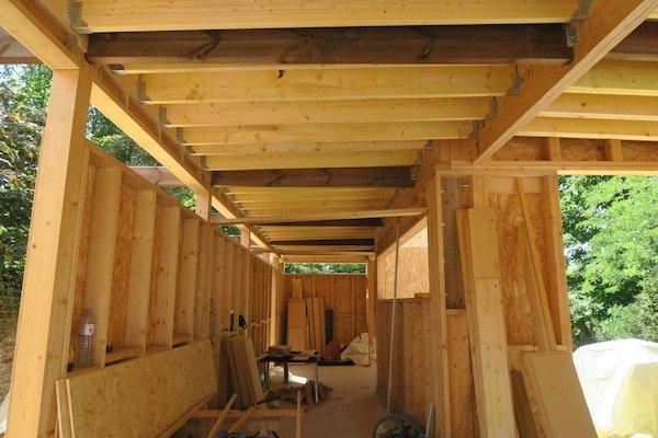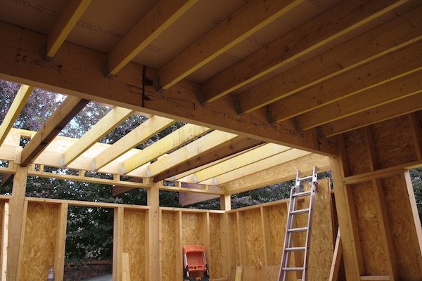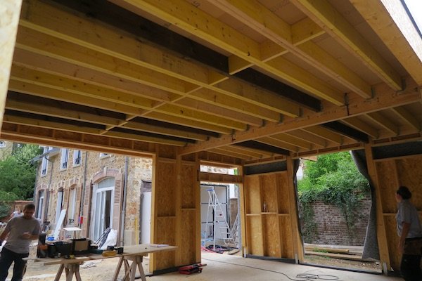 Photo 8 : la grande poutre en Lamibois de 7 mètres soutient le bandeau extérieur, qui sera habillé en red cedar