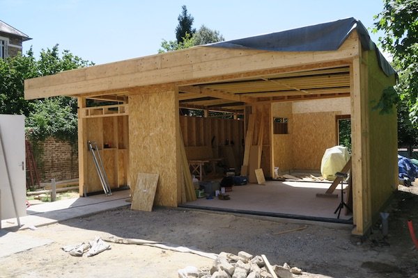 Photo 3 : les madriers en pin traité marron sortent de la structure et soutiendront l’auvent extérieur de la grande façade