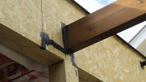 Photo 7 : nous traitons très soigneusement les points singuliers des madriers en pin qui vont sortir en porte-à-faux pour soutenir l’auvent ; pour éviter tout défaut d’étanchéité à l’air et à l’eau.
