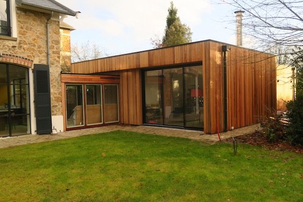 Extension en bois très contemporaine de 100 m2 devant une belle meulière fin 19ème dans les Yvelines