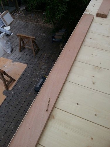 Photo 1 : une fois les panneaux de toiture installés, nous fixons sur ceux-ci une semelle en contreplaqué de 40 mm, identique à celle que nous avons pour la pose des murs