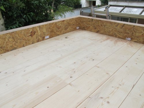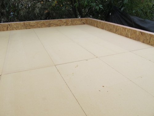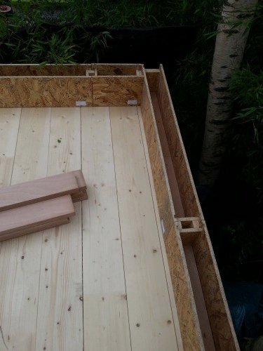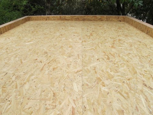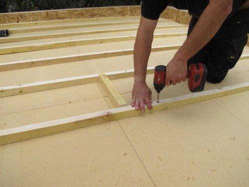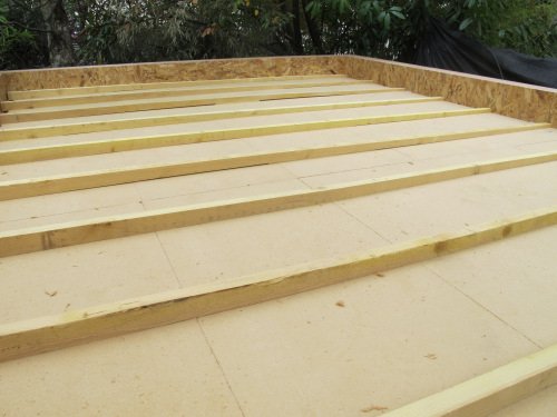 Photo 9 : puis nous installons des plaques de plancher e OSB sur les tasseaux. Le vide d’air créé par l’épaisseur des tasseaux contribue encore au confort du studio de jardin