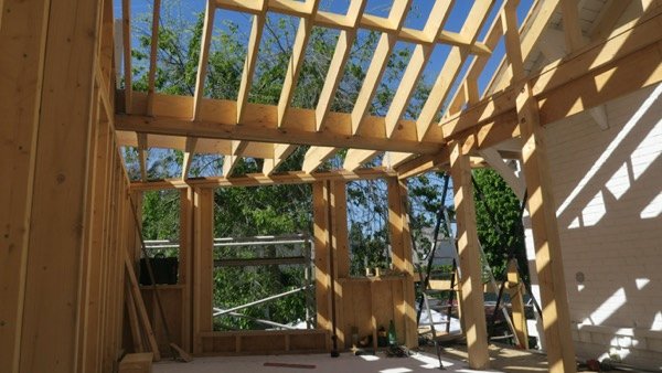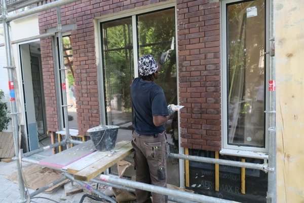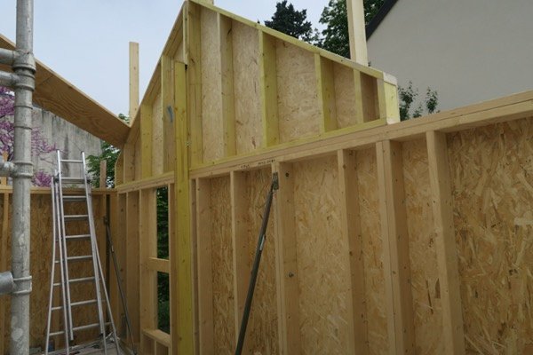 Voici une grande extension de 70 m2 sur deux étages, intégrée à une maison traditionnelle en briques avec un toit traditionnel en ardoises.