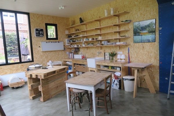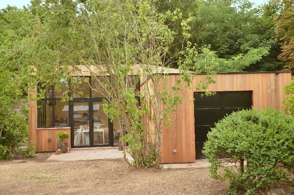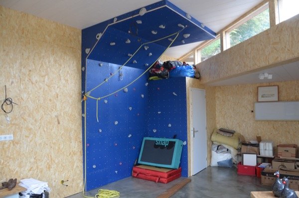 Grande extension en bois contemporaine, pour toute la famille : atelier d’artiste, mur d’escalade, espace musique, bricolage et rangement
