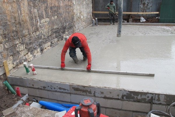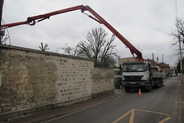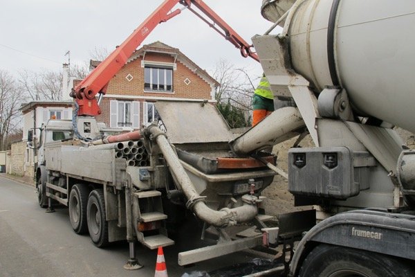 Photo 1 : pour gagner du temps et bénéficier d’un béton de qualité, nous avons fait venir une pompe à béton et des toupies de béton déjà préparé
