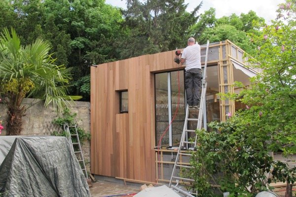 Grande extension en bois contemporaine, pour toute la famille : atelier d’artiste, mur d’escalade, espace musique, bricolage et rangement