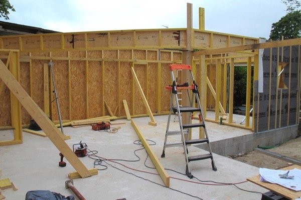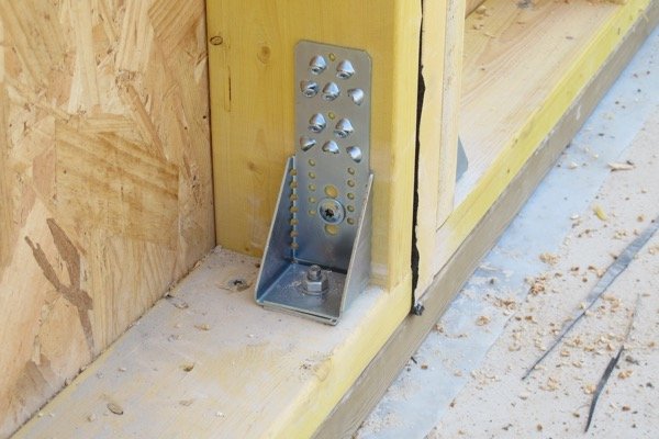 Photo 4 : ancrage des murs en ossature bois dans la dalle béton avec les équerres renforcées spéciales