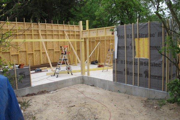 Photo 2 : montage des murs. Nous construisons l’acrotère du toit plat en même temps que les murs.