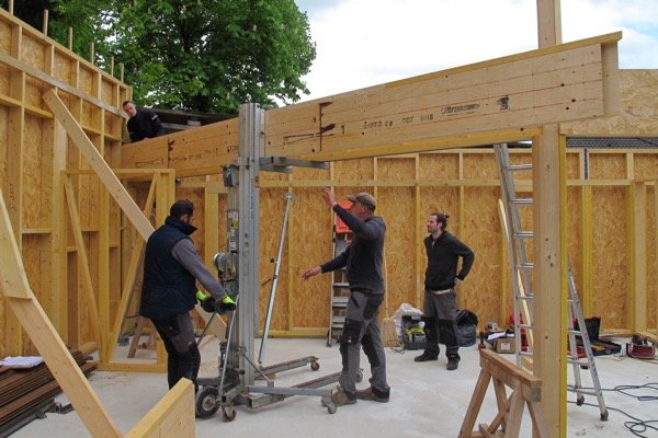 Photo 7 : levage de la grosse poutre en Lamibois avec un monte-matériaux. La poutre fait plus de 150 kg et nous devons la monter à plus de 3,50 m