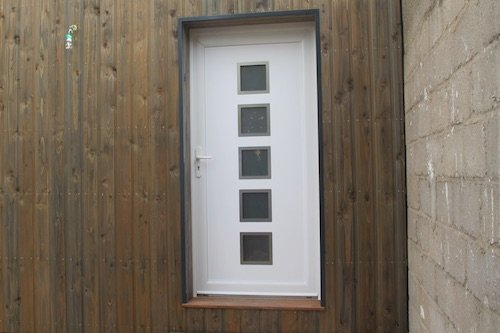 Photo 4 : porte d’entrée en PVC avec carreaux, modèle Beta, avec seuil en bois exotique