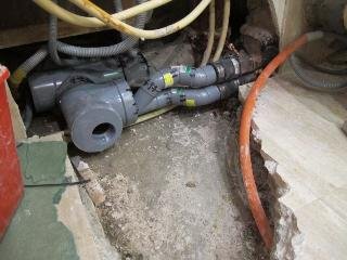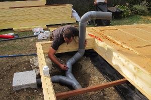 Mise en place des tuyaux d’évacuation des toilettes et de la douche d’un studio de jardin.