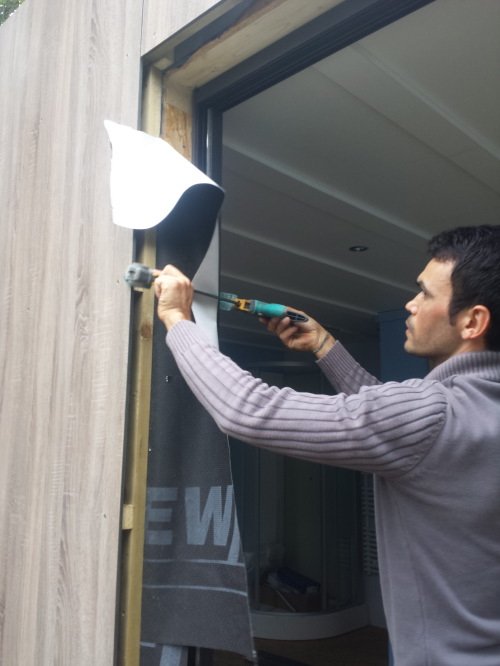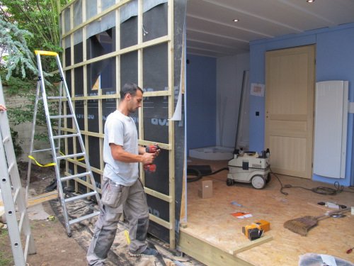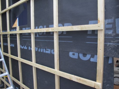 Photo 1 : les murs sont protégés avec un pare-pluie de qualité. Puis nous installons des liteaux pour supporter le bardage.