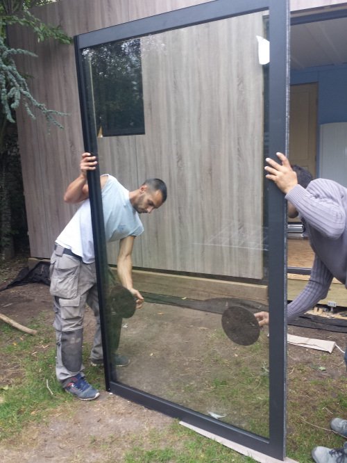 Etape 5 : mise en place du bardage et des menuiseries (baies vitrées, fenêtres)