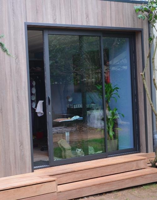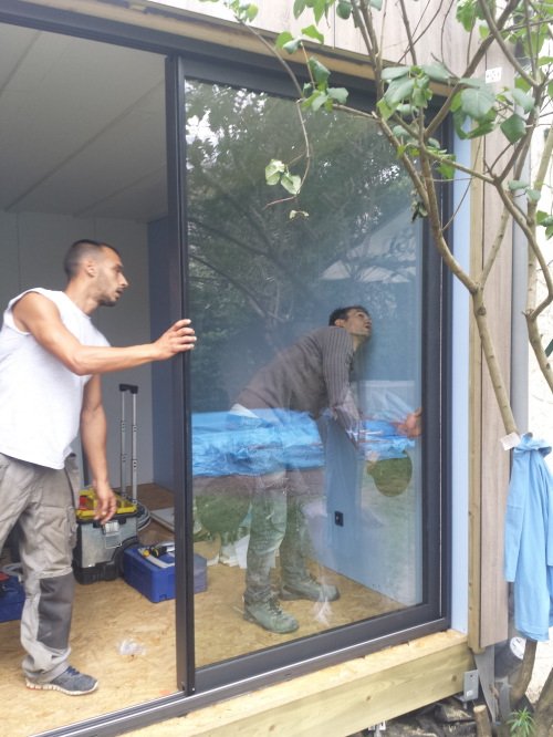 Photo 7 : Nous utilisons des baies et fenêtres en aluminium haut de gamme avec rupture de pont thermique, construites spécialement en France pour nos studios et bureaux de jardin. Le double-vitrage Saint-Gobain est en 6/18/4 : vitres de 6 et 4 mm et vide d’air de 18 mm, rempli de gaz Argon, inerte. La vitre intérieure est traitée ITR (Isolation Thermique Renforcée).