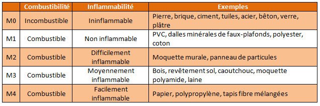 En fonction de leur pouvoir calorifique, les matériaux de construction sont classés en cinq familles, allant des matériaux facilement inflammables (M4) aux matériaux incombustibles (M0).