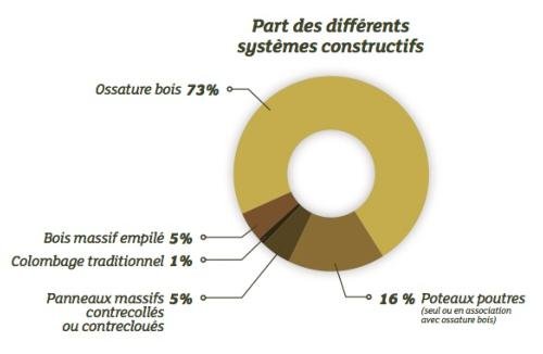 L’ossature bois est le système constructif le plus utilisé en construction bois de maison individuelle (73%), suivi, de très loin, du système poteaux poutres (16 %, pouvant intégrer une certaine part de mixité ossature bois/poteaux poutres) puis du bois massif empilé (fuste, madrier) et des panneaux massifs contrecollés ou contrecloués.