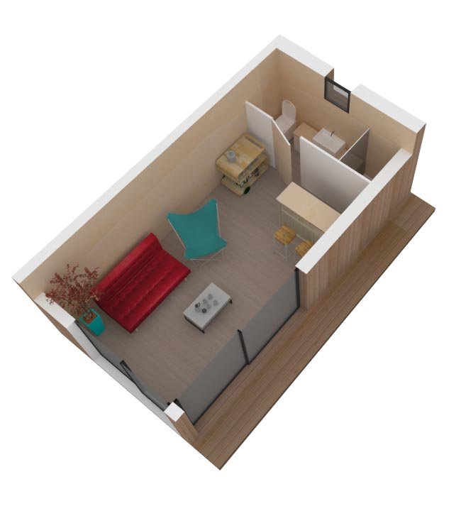 Nos maisons en bois de 19 m2 sont spacieuse, avec une belle hauteur de plafond (2,30 m). Vous avez une grande liberté d’aménagement