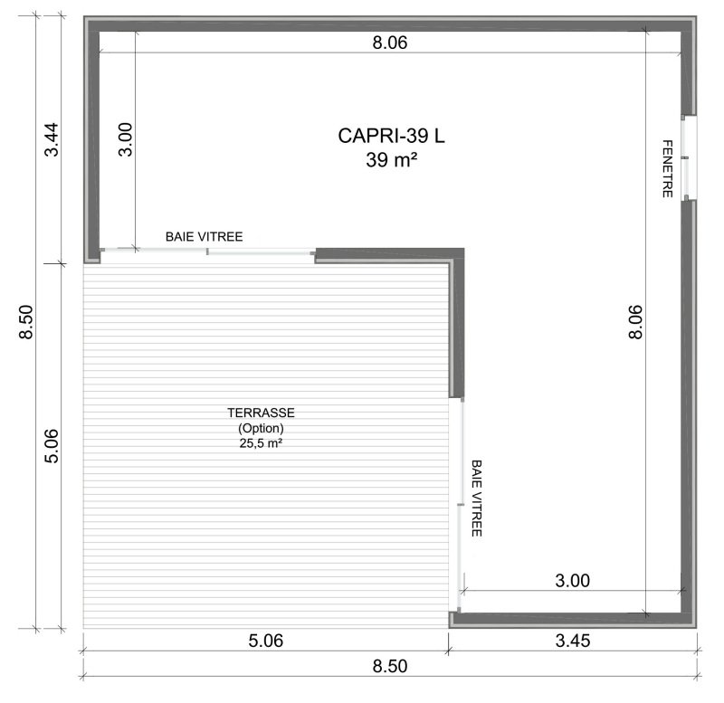 8,50 X 3,50 m / 48 m2 (côtés du L)