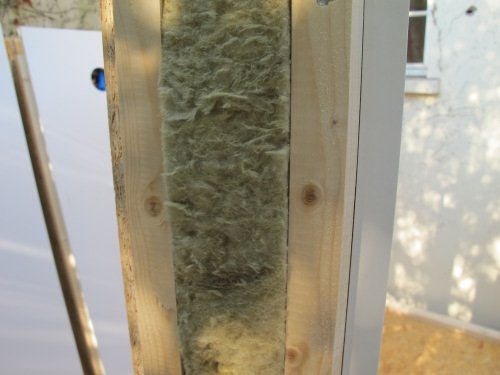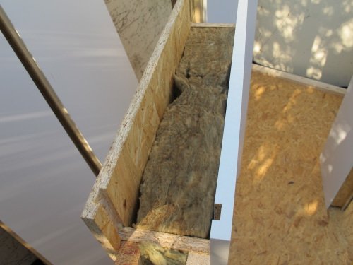Photo 4 : voici l’intérieur de nos murs : un isolant en laine de roche de 12 cm d’épaisseur est emprisonné dans le bloc-mur en OSB 4, soit un mur de 15 cm d’épaisseur