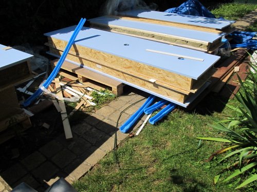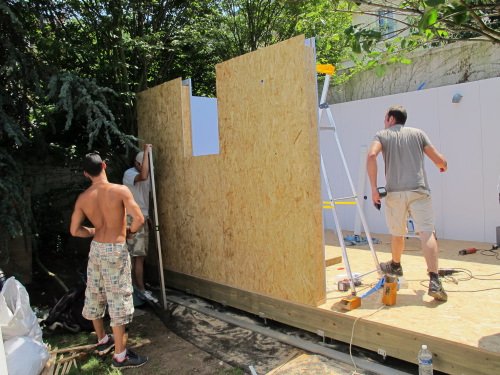 Photo 3 : les pans de murs préfabriqués du studio de jardin sont amenés sur le chantier et positionnés dans l’ordre de montage. Les murs sont déjà habillés sur leur face intérieure avec des panneaux de mélaminé de la couleur (ou décor bois) choisi par le client. Dans notre projet, trois murs sont bleus et un mur est blanc. C’est la grande force de notre procédé : dès que les murs sont construits, l’intérieur est fait. Pas besoin de plaque de plâtre, d’enduit, de peinture…