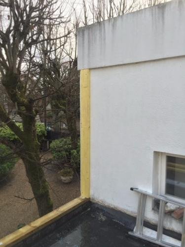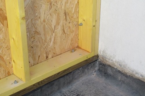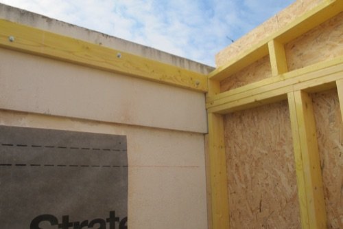Photo 11 : Sur le murs béton, nous avons fixé une « muraillère », un montant d’ossature en bois, qui servira d’appui pour les panneaux de toiture