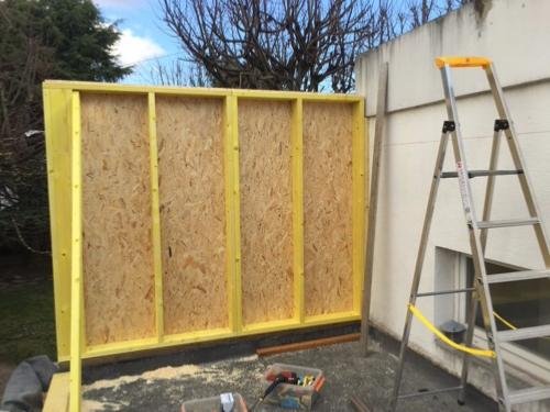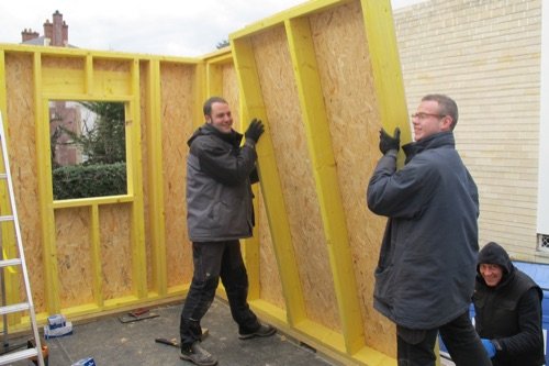 Photo 5 : nous avons préfabriqué en atelier des petits murs en ossature bois, qu’il est très facile de hisser sur le chantier. Pour des projets plus importants ou avec des murs plus grands, nous aurions utilisé un petit engin de levage.